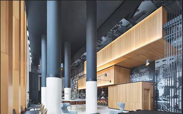 蒙維爾酒店,這是一家以工業(yè)風(fēng)為基調(diào)的酒店,黑白黃是酒店使用zui多的顏色,大堂的中央設(shè)有一個(gè)菱形的白色水磨石吧臺(tái),搭配以黃銅材質(zhì)的細(xì)部。經(jīng)典堅(jiān)硬與柔軟并存的創(chuàng)意指引了客人在此停留或休閑的和一杯咖啡,體會(huì)這舒適的感覺。