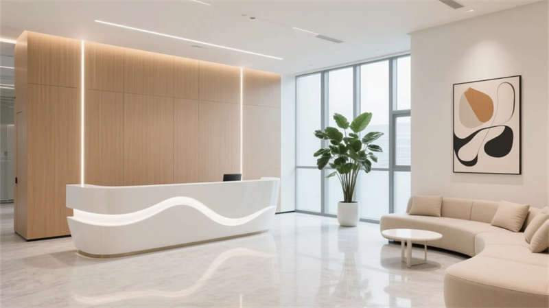 本設(shè)計以現(xiàn)代簡約為核心理念,通過光與自然的交融重塑辦公體驗??臻g以純凈的白色與溫潤木色為主調(diào),輔以低飽和度灰綠點綴,營造通透靜謐的氛圍。落地窗最大化引入自然光線,與線性燈帶共同勾勒出流暢的視覺韻律;綠植貫穿每個角落,從大堂的琴葉榕到辦公區(qū)的垂直花園,賦予空間呼吸感。