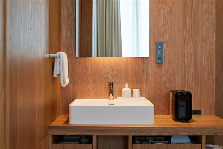 總共79間客房中,最緊湊的客房橫寬僅有2.1米。在這細長房間內(nèi),配置了讓旅途疲憊者身心徹底放松的元素。如設置了符合人體工學的床墊,觸感柔軟的浴巾,柔和溫馨的照明等,營造了超乎尋常的舒適空間。