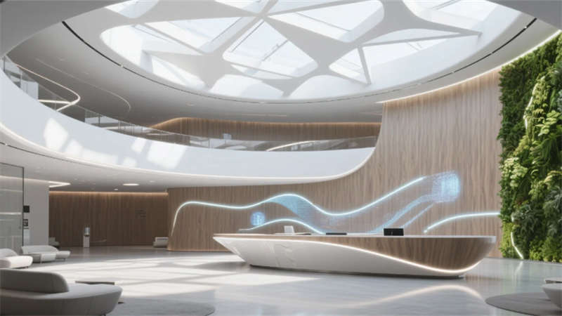 這座人工智能核心建筑以“人本科技”為基因,將自然生態(tài)脈絡(luò)植入未來(lái)科技肌理。流動(dòng)空間打破傳統(tǒng)辦公界限,智能大堂的垂直森林與數(shù)據(jù)藝術(shù)共生,協(xié)作艙如發(fā)光的神經(jīng)節(jié)點(diǎn)散布于開(kāi)放平面。實(shí)驗(yàn)室成為科技與自然對(duì)話的劇場(chǎng),玻璃幕墻外竹林隨風(fēng)搖曳,室內(nèi)數(shù)據(jù)流如星軌閃爍。