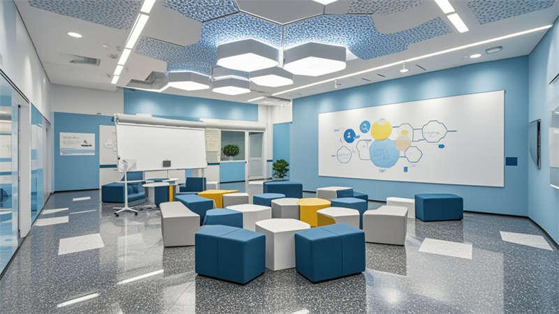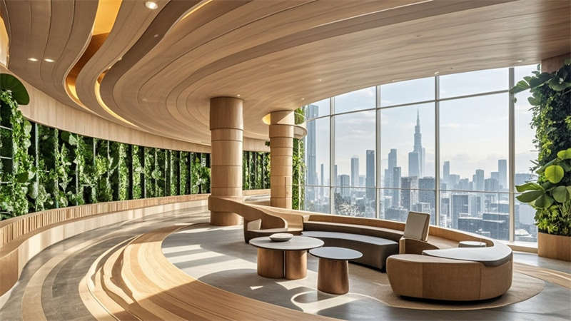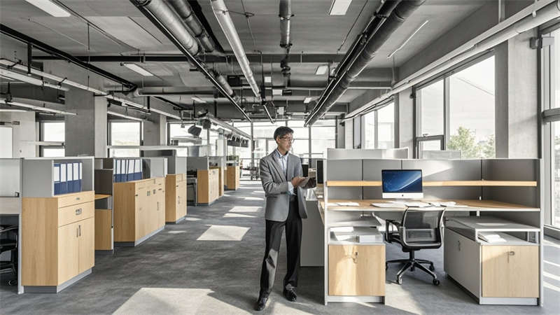 本1500㎡現(xiàn)代簡約辦公室設計以'高效協(xié)作·人文關懷'為核心,采用模塊化空間布局提升使用彈性。主色調(diào)選用淺灰、白、木三色系,局部點綴企業(yè)深藍色強化品牌認知。開放式辦公區(qū)采用1.2m×1.8m標準工位模塊,通過玻璃隔斷實現(xiàn)90%自然光滲透率。智能照明系統(tǒng)根據(jù)日照強度自動調(diào)節(jié)色溫,全年節(jié)電率達35%。核心筒改造區(qū)運用曲面木飾面弱化建筑結(jié)構(gòu),形成自然交流節(jié)點。聲學設計方面,蜂窩吸音板(NRC 0.85)與隔音艙(STC 52)組合控制噪音污染。茶水區(qū)采用磁吸軌道插座系統(tǒng),支持設備靈活接入。所有家具均符合WELL建筑標準,辦公椅配備6向調(diào)節(jié)功能。通過BIM技術實現(xiàn)管線綜合,保留3.2米凈高營造開闊感。