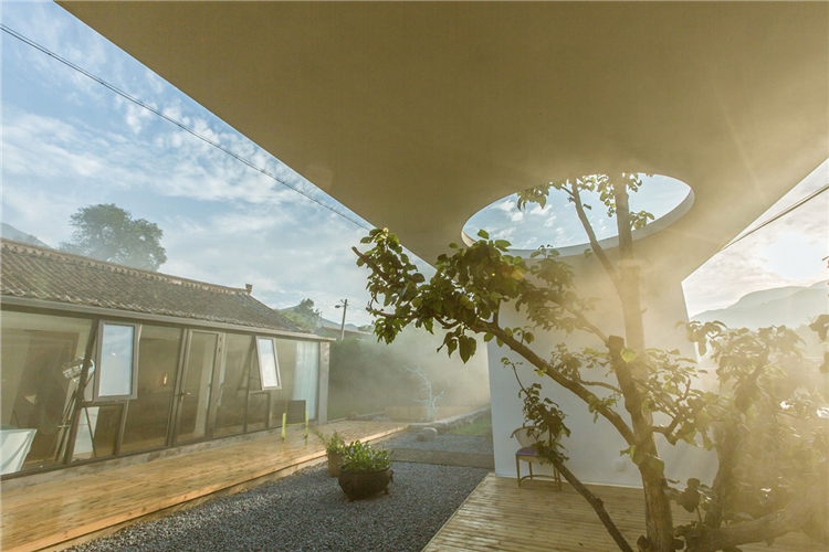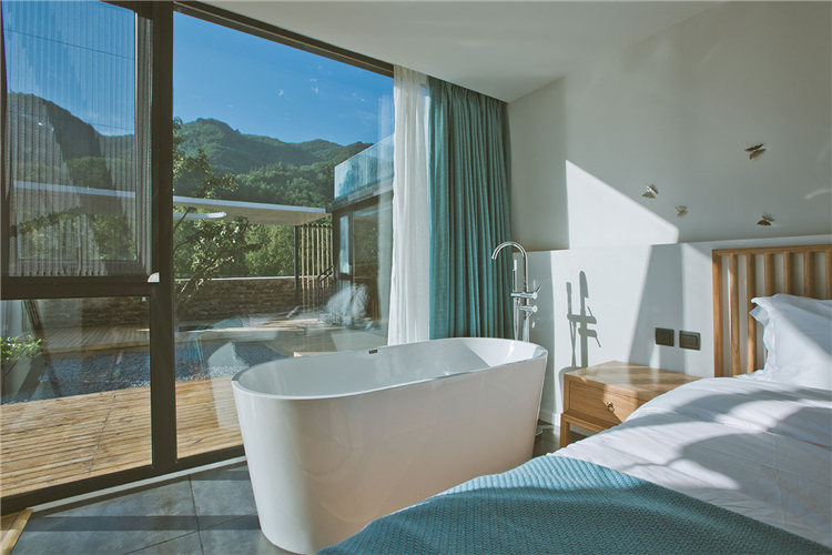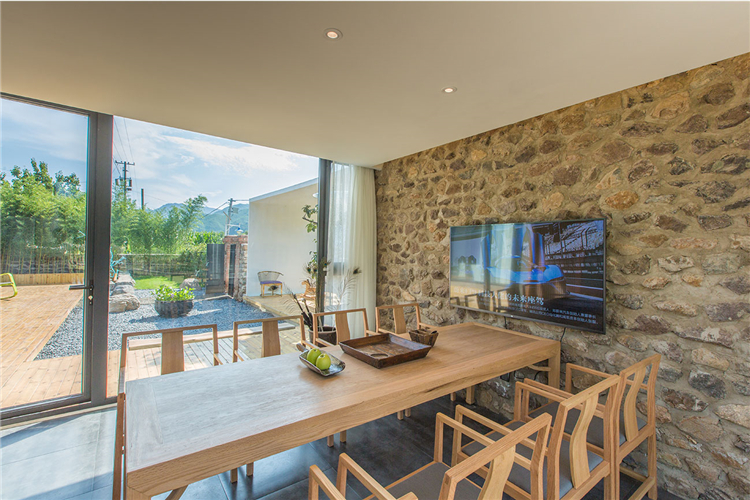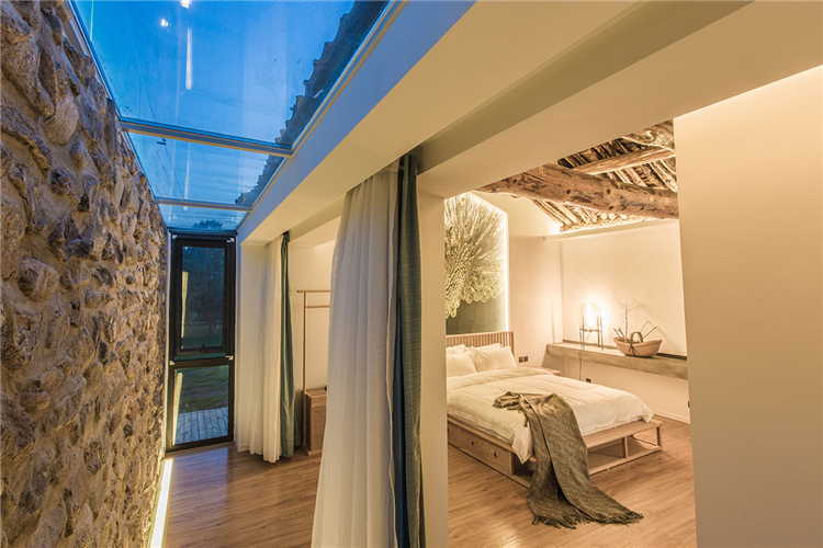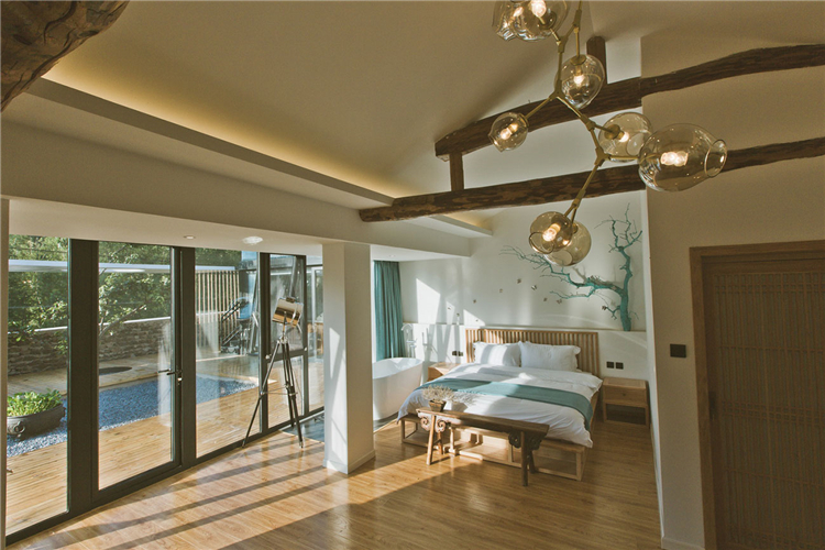 “隨著越來越快的生活節(jié)奏我們每天奔忙,每天遺忘城市越來越近,鄉(xiāng)村卻越來越遠(yuǎn)”。這所名為“畫框里”的民宿位于水泉子村,而名字寓意為將百里畫廊的山水美景留在畫中院中??煽吹矫逼鋵?shí)靈動的山水畫這四季的變幻,凝集了我們對生活所有的向往。落地窗邊放置了浴缸做一個(gè)泡泡浴一眼望去是院落的美景和遠(yuǎn)山的意境。主臥空間很寬敞,新中式的原木配灰色的簡易家具些許的現(xiàn)代元素金屬攝影燈使房間內(nèi)多一份輕松感。