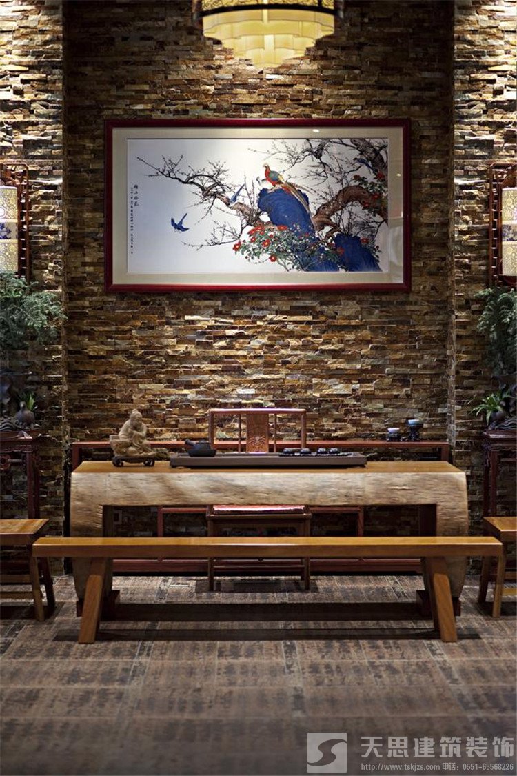 現(xiàn)代時尚吊燈配以明式簡約紅木圈椅平添幾分現(xiàn)代生活氣息的景致芳華韻味。風(fēng)景優(yōu)美的水墨畫與絕妙雕工的座屏形成一種無言的美。大氣凜然的中式天花板吊頂將屋里的一切照的豐富多彩,妙趣橫生。
