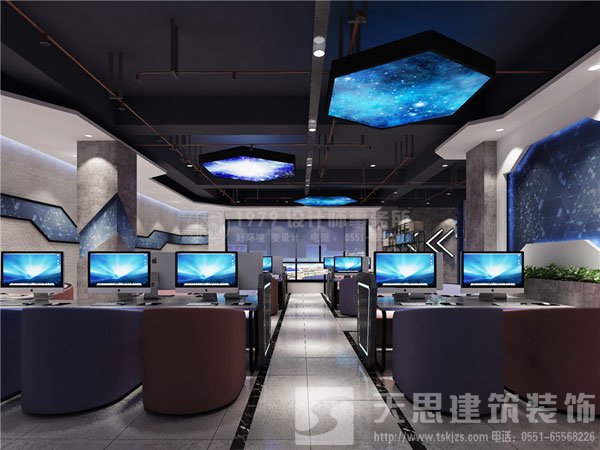 合肥網(wǎng)咖設(shè)計(jì)裝修的一般風(fēng)格: 綜合運(yùn)用幾何圖案、造型、材質(zhì)、色彩、飾物等手段,設(shè)法營造一種在家上網(wǎng)無法體驗(yàn)的環(huán)境氛圍,讓上網(wǎng)者體驗(yàn)到或清新明快、或典雅莊重、或閑適淡