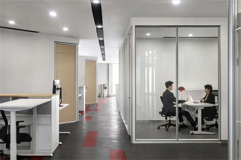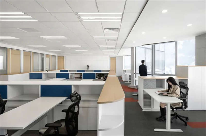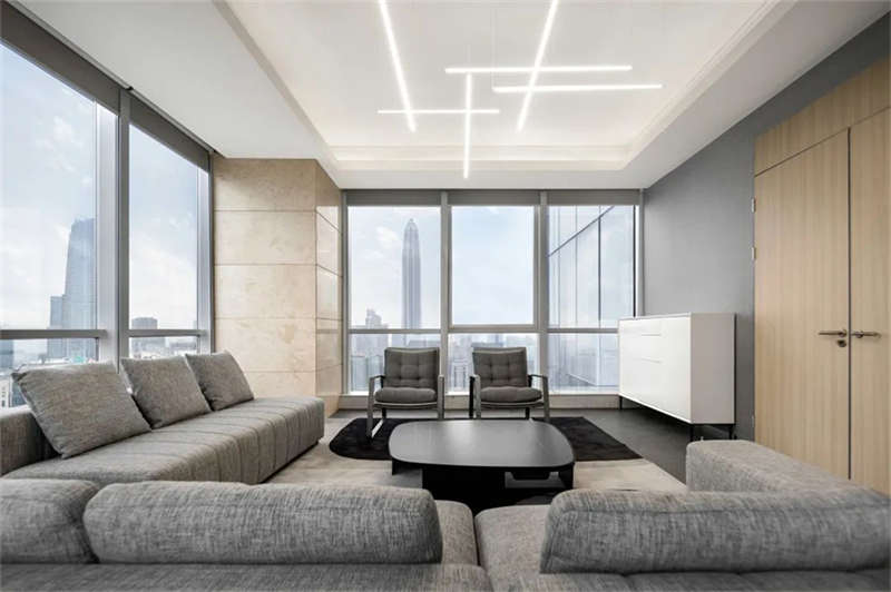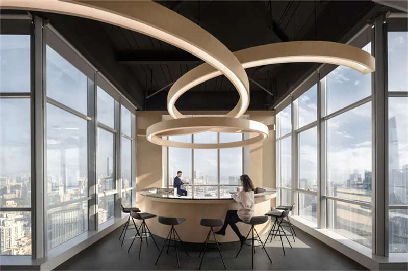 由于原辦公室把獨(dú)立辦公室放在靠幕墻一側(cè)導(dǎo)致開放辦公區(qū)光線不足,在改造過程中設(shè)計(jì)師把獨(dú)立辦公室往核心區(qū)域設(shè)置,把幕墻一側(cè)打開,陽光傾瀉,將城市天際線和內(nèi)部空間的交互限制解除,讓城市天空與四季變化成為空間的景觀和陳設(shè)。