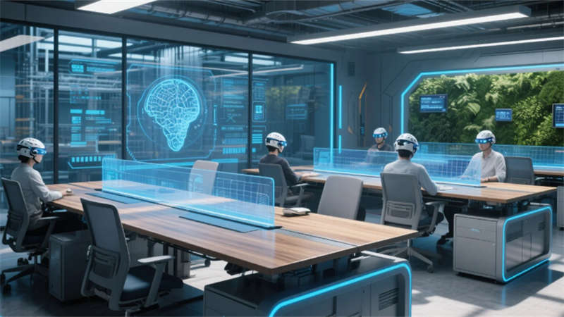 生態(tài)基因貫穿每個(gè)細(xì)節(jié):光伏連廊的遮陽(yáng)發(fā)電結(jié)構(gòu)隨日照角度變幻肌理,雨水回收裝置化作中庭的液態(tài)雕塑,木紋鋁材桌面流淌著實(shí)時(shí)產(chǎn)能數(shù)據(jù)。智慧會(huì)議室的聲學(xué)穹頂折射出數(shù)據(jù)暴雨,玻璃幕墻在沙漠與極地場(chǎng)景間瞬時(shí)切換,腕表投影界面與全息沙盤(pán)構(gòu)成決策中樞。