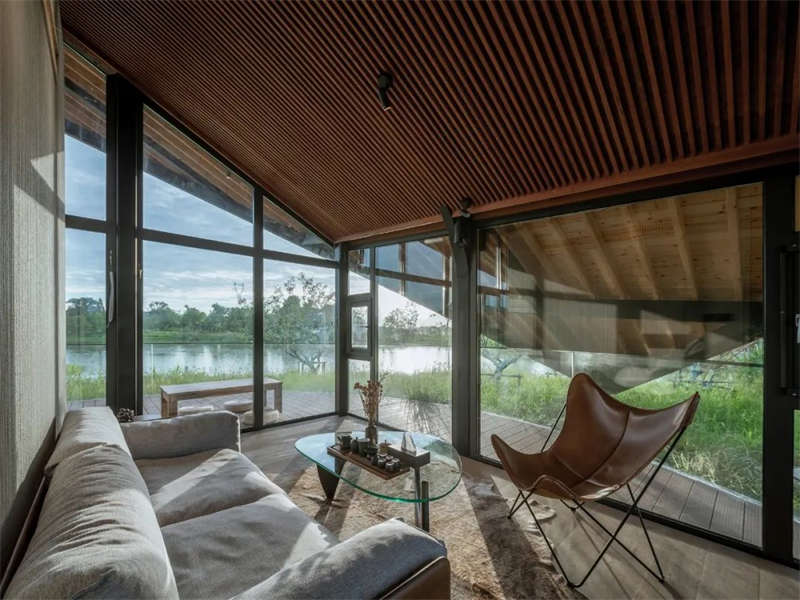 在界面考慮上,客廳設(shè)置了可全部移開的轉(zhuǎn)角落地窗,全部打開之后濕地的湖面水生植物露臺(tái)室內(nèi)就全部融為一體了,這時(shí)打開入戶門還會(huì)有穿堂風(fēng),空間很舒服,臥室設(shè)置在為一個(gè)高起來兩級(jí)踏步的空間體量中,有趣的是臥室頂上開了一個(gè)三角窗,在床上可以透過三角窗看到屋頂?shù)哪緲?gòu)架和天空,衛(wèi)生間體量則布置在背面,與臥室連接,在大浴缸邊上設(shè)置了可全部開啟的落地門窗,泡澡時(shí)可以全部打開,有一種在戶外泡澡的體驗(yàn),衛(wèi)生間外面還有一個(gè)露臺(tái),泡完澡之后可以到露臺(tái)上坐坐休息。