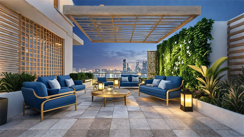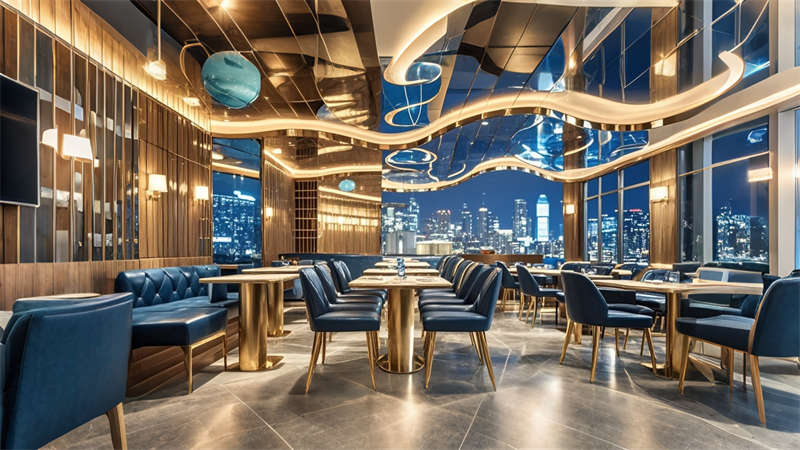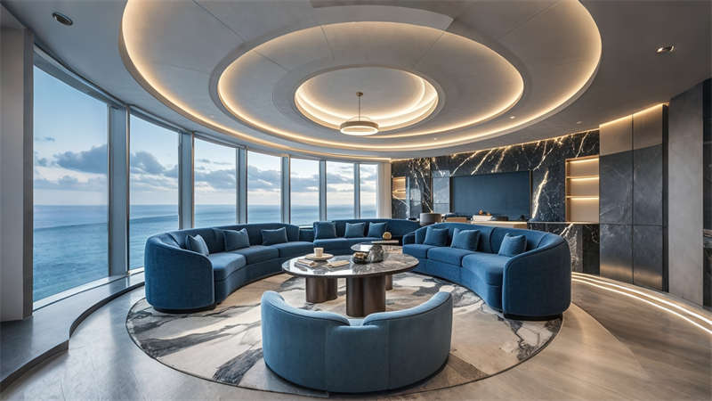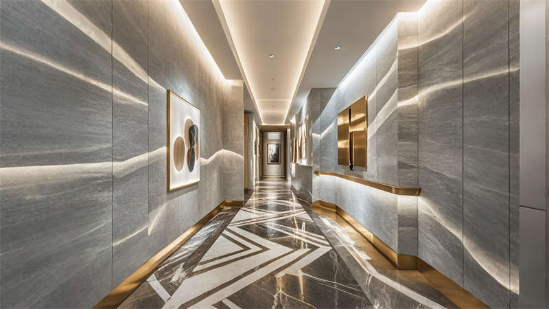色彩體系以香檳金與深海藍(lán)為主調(diào),大堂采用香檳金金屬線條勾勒建筑肌理,搭配深海藍(lán)大理石營(yíng)造視覺(jué)重心??头繀^(qū)運(yùn)用暖灰硬包墻面平衡色彩強(qiáng)度,通過(guò)2700K暖光與4000K中性光分區(qū)照明塑造晝夜場(chǎng)景。材質(zhì)組合注重層次:大理石地面、金屬構(gòu)件、絨布軟包形成質(zhì)感三部曲。