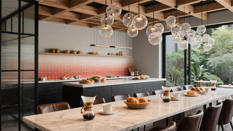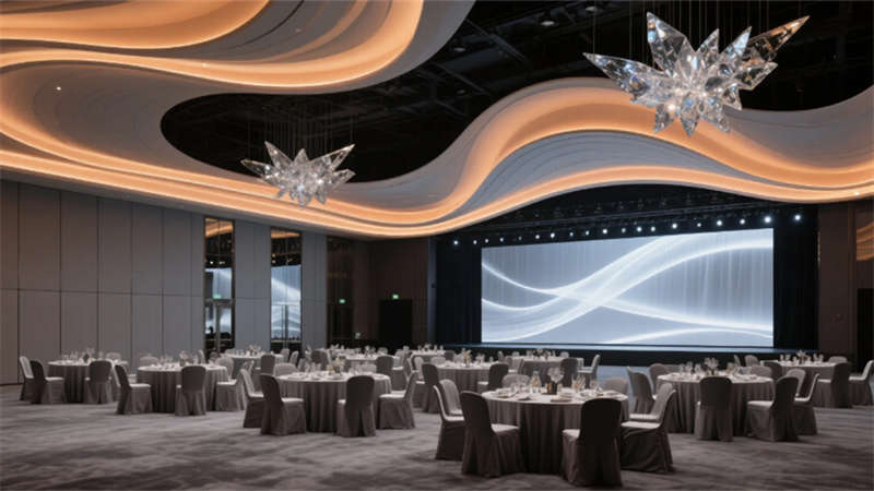 全日餐廳以陶土色格柵天花呼應(yīng)徽州傳統(tǒng)工藝,吹制玻璃吊燈如晨露凝結(jié)空中;宴會廳則化身未來劇場,波浪形織物天花與全息投影幕布共舞光影。行政樓層的商務(wù)休息區(qū),深灰毛氈墻面與古銅金屬細節(jié)沉淀出理性優(yōu)雅,窗外綠意透過玻璃隔斷滲入交談空間。從屋頂無邊泳池俯瞰,建筑與巢湖的瀲滟水色遙相呼應(yīng),于繁華處開辟一方隱逸凈土——這里不僅是居所,更是一場喚醒感官的設(shè)計敘事。