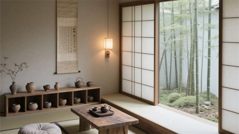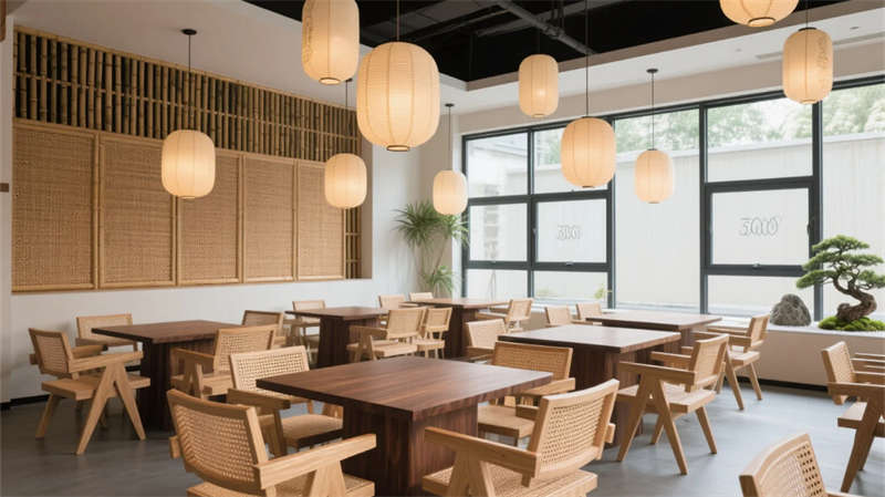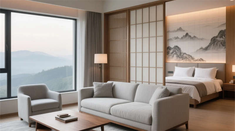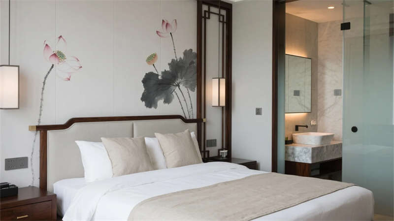 大堂以格柵天花與山水背景墻定調(diào),光影交錯(cuò)間傳遞寧?kù)o力量。餐廳借竹編與紙燈演繹傳統(tǒng)匠心,窗外庭院景觀延伸視覺(jué)層次??头哭饤壏睆?fù)裝飾,棉麻材質(zhì)與低飽和度色彩引導(dǎo)深度放松,套房通過(guò)屏風(fēng)巧妙劃分動(dòng)靜區(qū)域。茶室以博古架和宣紙屏風(fēng)構(gòu)筑禪修意境,而庭院花園的枯山水與竹影,則成為自然與建筑的共生隱喻。