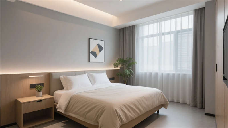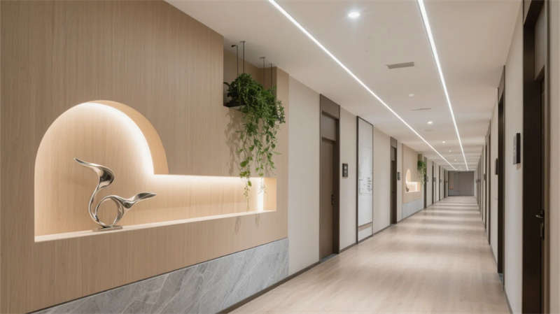 酒店以現(xiàn)代簡約美學(xué)貫穿始終,走廊作為串聯(lián)各區(qū)域的紐帶,延續(xù)了整體的設(shè)計語言?;⌒伪邶惻c懸浮天花板的線性燈光,柔和地引導(dǎo)動線,淺木飾面與石材的碰撞在低調(diào)中彰顯質(zhì)感。壁龕內(nèi)的藝術(shù)擺件與垂墜綠植,將自然氣息融入過渡空間,打破傳統(tǒng)走廊的單調(diào)感。