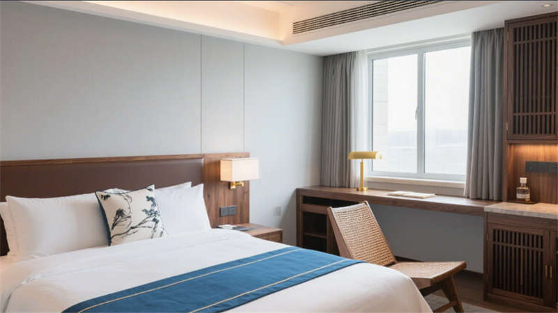 步入大堂,深胡桃木墻面與淺灰石材地面構(gòu)成經(jīng)典東方底色,水墨藝術(shù)玻璃屏風(fēng)似山巒疊嶂,懸浮竹編吊燈以編織肌理軟化空間。靛藍(lán)色沙發(fā)與黃銅細(xì)節(jié)的點綴,既延續(xù)外立面色彩邏輯,又激活視覺層次。餐飲空間延續(xù)木格柵語言,竹編燈罩與黑陶器皿在開放式廚房的金屬框架中碰撞,演繹“新舊共生”的餐飲儀式。