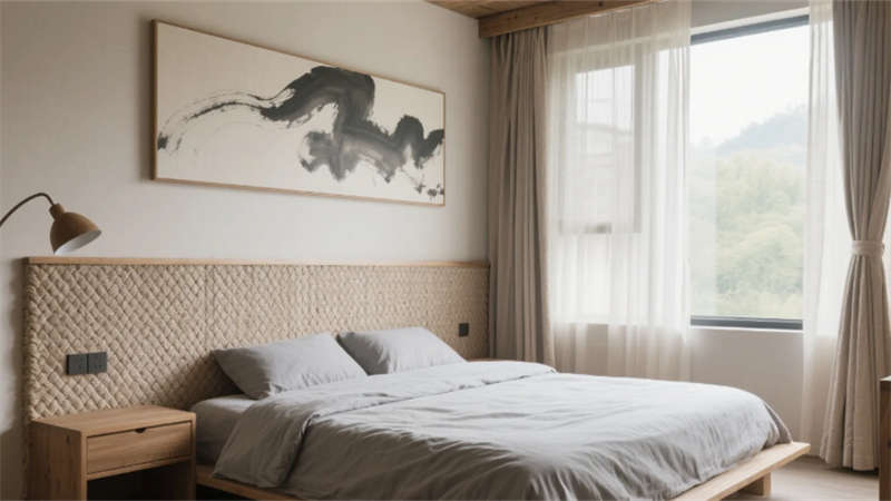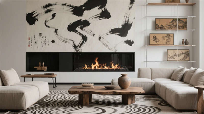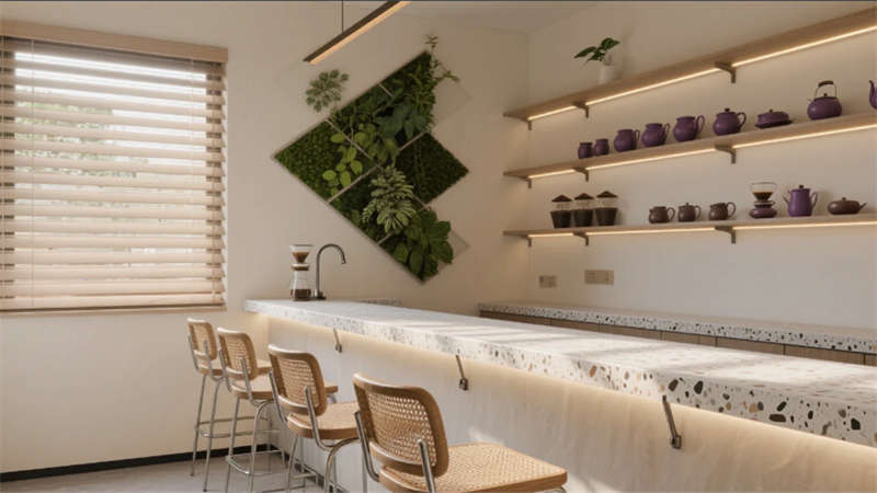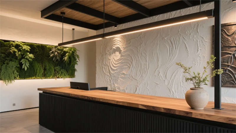 步入大廳,弧形亞麻沙發(fā)與編織地毯圍合出松弛場(chǎng)域,整面落地窗借景庭院竹影,琴葉榕與懸浮綠植墻形成立體生態(tài)敘事。多功能區(qū)以巢湖水波紋地毯呼應(yīng)地域脈絡(luò),壁爐旁的非遺火筆畫裝置暗藏城市文化密碼??Х劝商倬幾闻c水磨石臺(tái)面碰撞,幾何綠植墻在百葉光影中演繹晨昏詩意。