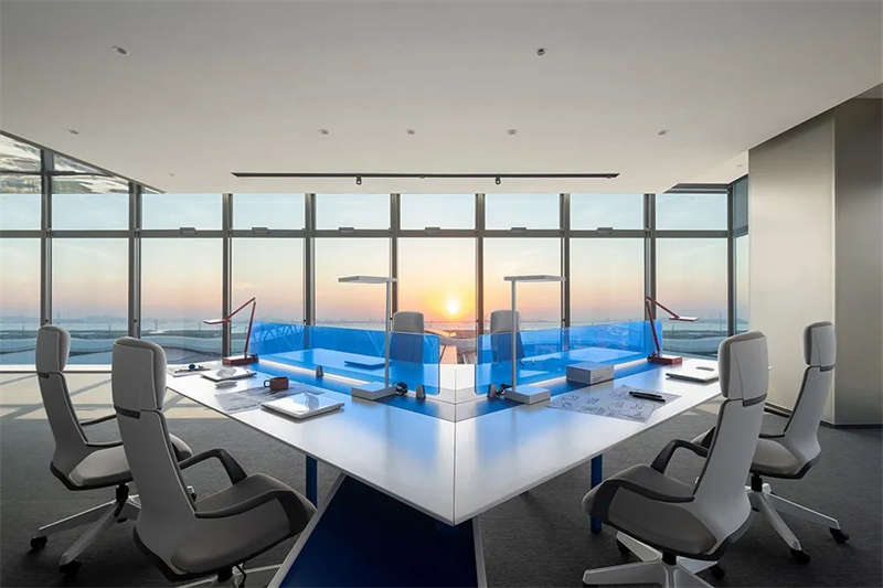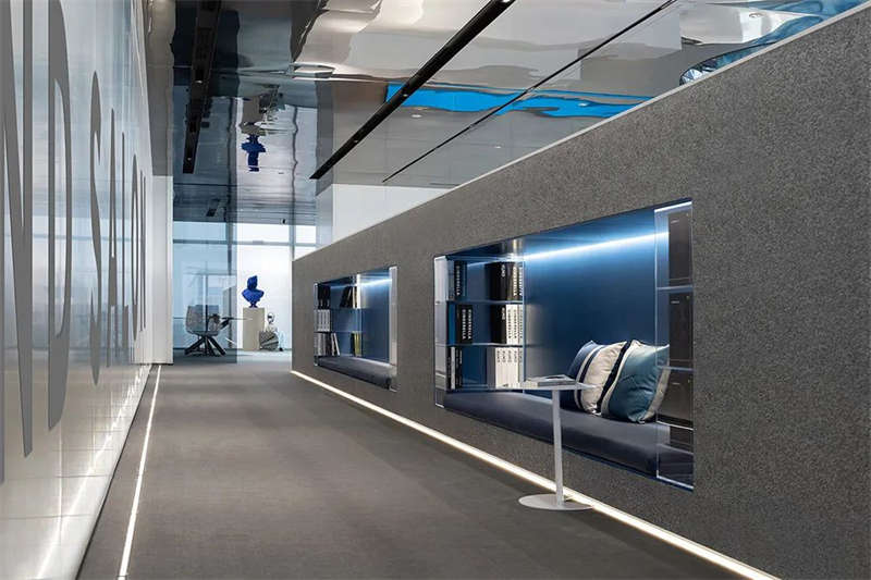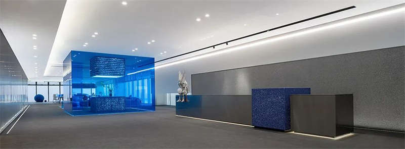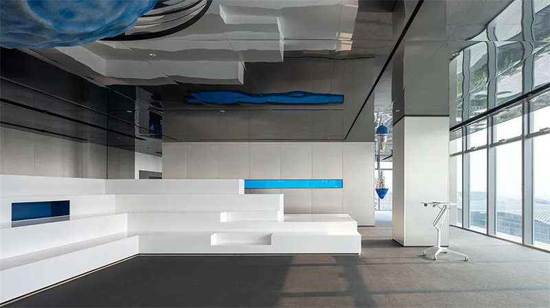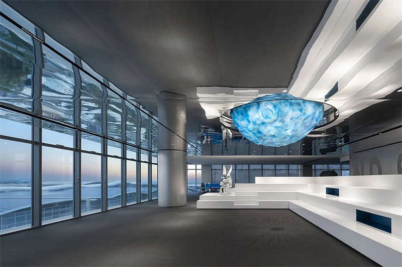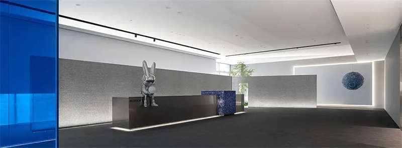 室內(nèi)空間由功能家具和裝置形成自然分隔,空間整體因祛除隔斷而產(chǎn)生了流動(dòng),這與科學(xué)巨匠斯蒂芬·霍金的宇宙觀具有一種相通性。太空兔和隕石一起來(lái)到這里,被安置在接待臺(tái)和會(huì)議室中,向來(lái)訪的人們講述宇宙的故事,猶如那些激動(dòng)人心的創(chuàng)業(yè)事跡一樣,源于有限的奇點(diǎn),產(chǎn)生突破界限的無(wú)窮能量。