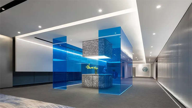 設(shè)計(jì)師在灰調(diào)的空間中,注入純凈的克萊因藍(lán),高飽和度的單純色彩具有神奇的魔力,讓人們?cè)趶?qiáng)烈的視覺(jué)沖擊下迷失感官,與室外的海天融通一體,達(dá)致沒(méi)有感官桎梏的心靈自由;灰色則讓空間保有充裕的從容,以及留白的呼吸感。以此實(shí)踐在物質(zhì)之上,具有純粹精神的空間情景。