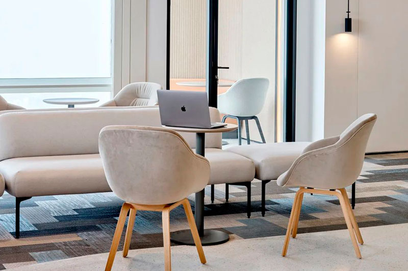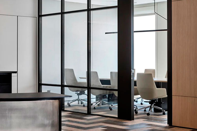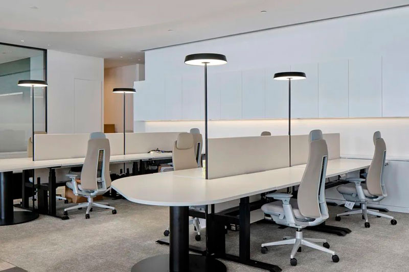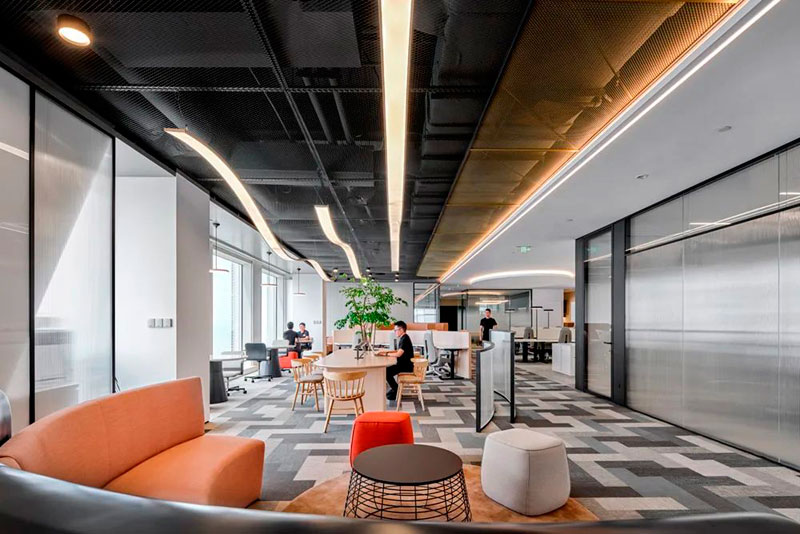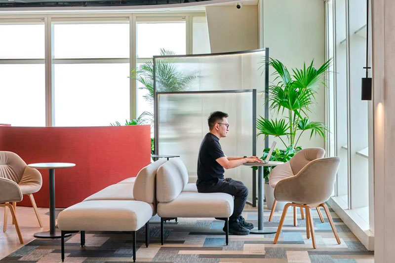 后場辦公區(qū)延續(xù)了前廳的辦公理念,結(jié)合不同功能形式的會議室、電話間,提供了多選擇的工作模式,簡潔而高效。大量可再生面料的墻飾、可回收吸音板和仿生苔蘚的應用,豐滿了視覺層次并極大提升了空間的聲學效果。