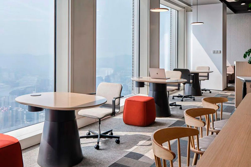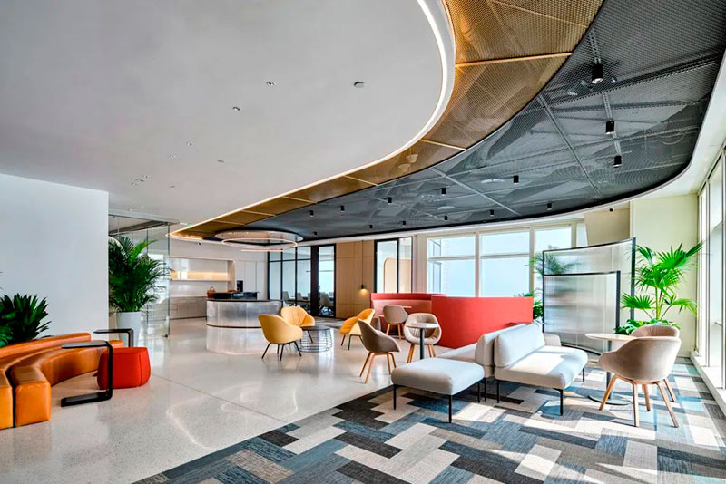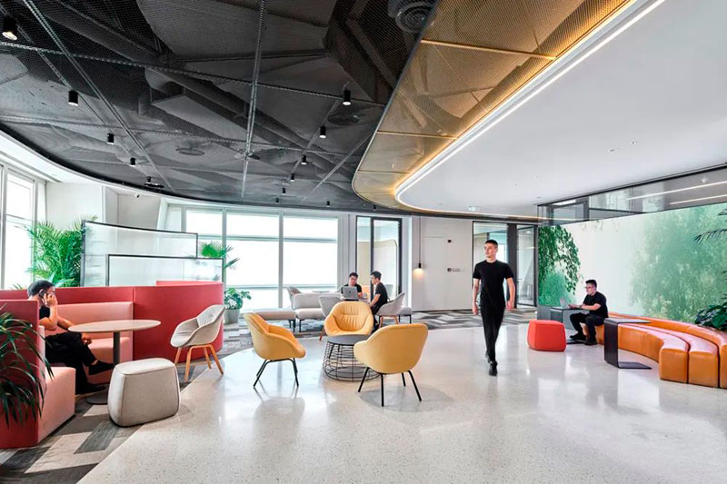 不同于投資公司的傳統(tǒng)形象,設計師以一個圓島吧臺和開敞的自由交流區(qū)作為前廳接待場所。大量的自然光涌入室內(nèi),明凈開闊。天花地面是圓轉(zhuǎn)流動的曲線造型,采用水磨石地面、金屬網(wǎng)天花、Bolon塑膠地毯等各種新環(huán)保材料,輔以色彩鮮麗的多功能家具組合、大型LED屏和隨處點綴的綠植,呈現(xiàn)出年輕、現(xiàn)代、科技而又充滿能量的生命氣息。