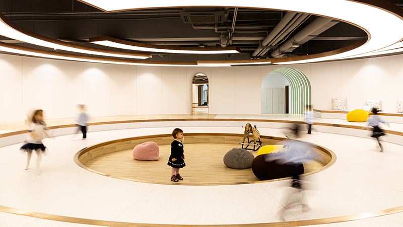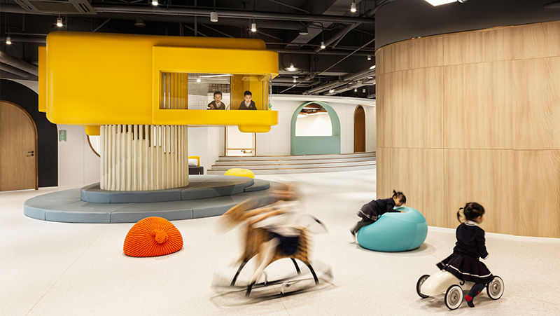 兒童喜歡通過身體來丈量和感知空間.因此,創(chuàng)造符合兒童生理尺度的空間能夠激發(fā)更多的行為方式.兒童也常喜歡待在自己可觸摸到的小空間中.設(shè)計創(chuàng)造出的空間價值可以賦予使用者特殊的魔力,在豐富多樣的教娛空間中,每一個孩子都是不受束縛的夢想家.用簡潔明亮的色彩把控,勾勒出空間內(nèi)不失童趣的高級質(zhì)感,培養(yǎng)孩子的基礎(chǔ)美學(xué)與審美素養(yǎng),正是空間帶來的啟蒙.