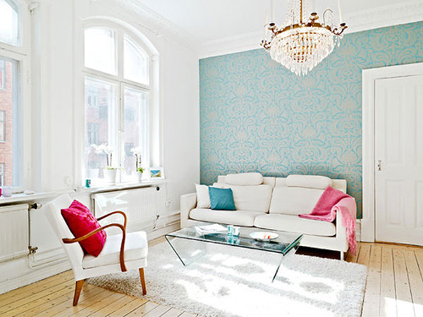 在華麗的水晶燈的照耀下,白色的北歐客廳裝修設(shè)計(jì)顯得清新亮麗,輕盈的塑料茶幾在柔軟的地毯上放縱的舞蹈,彩色的靠枕和墻紙是北歐客廳裝修的唯一色彩,藍(lán)花的壁紙烘托出北歐客廳的溫馨氣氛。