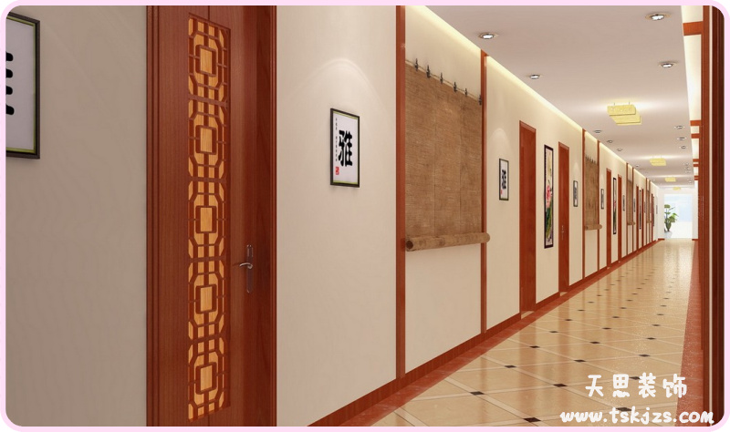 走廊是室內(nèi)流通空間的主要部分,其空間特點(diǎn)是狹長(zhǎng),且缺少變化,人在這種空間中容易產(chǎn)生單調(diào)感。因此,在設(shè)計(jì)上應(yīng)做一定的藝術(shù)處理。使其既不能過(guò)于華麗、復(fù)雜,也不宜過(guò)于簡(jiǎn)單、呆板、應(yīng)在墻壁上做一定的裝飾點(diǎn)綴。如做出口線、偏倚柱、外門套和墻壁裝飾線條的藝術(shù)處理,以及字畫(huà)或燈光的點(diǎn)綴。在特殊功能區(qū)的路段,可以做色彩變化或不同的裝飾處理,從而形成 統(tǒng)一中有變化的視覺(jué)效果。在通常情況下,走廊的設(shè)計(jì)要求是:應(yīng)有充足的光照度、統(tǒng)一和諧的界面裝飾,清新淡雅的色調(diào)和明確的導(dǎo)向指示。