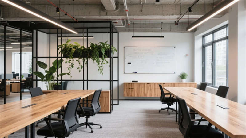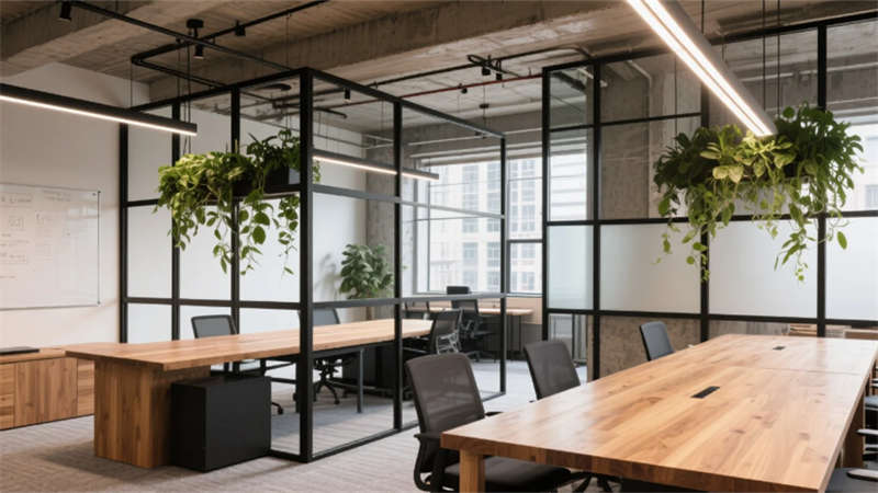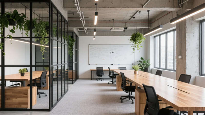 該辦公空間以暖調(diào)輕工業(yè)風(fēng)為靈魂,將冷峻的金屬骨架與溫潤(rùn)的竹木元素交織,在微水泥的灰調(diào)基底上鋪陳出理性與感性的平衡。開放辦公區(qū)借落地窗引光入室,綠植墻與軌道燈串聯(lián)起流動(dòng)的協(xié)作場(chǎng)景;獨(dú)立專注艙與水吧區(qū)形成動(dòng)靜分區(qū),滿足深度思考與即時(shí)社交的雙重需求。