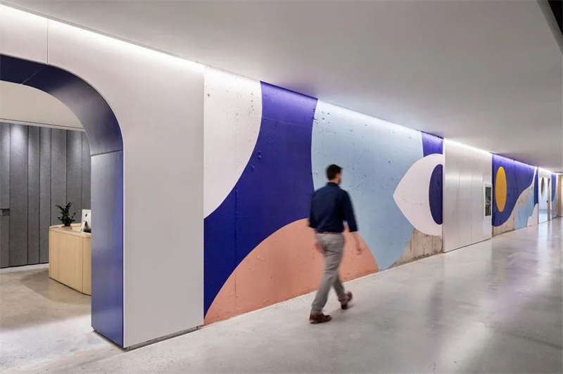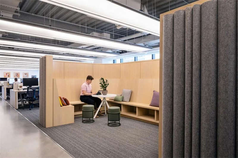 空間的聲學(xué)設(shè)計(jì)也經(jīng)過專業(yè)團(tuán)隊(duì)的仔細(xì)考量,以確保靈活的協(xié)作空間具有吸引力、舒適性和高效生產(chǎn)力。各種類型的會議空間從大型會議室到全面毛氈飾面的靜音“工作艙”;在辦公桌上方,采用了定制的聲學(xué)毛氈弧形擋板集成照明裝置,由此優(yōu)化開放工作區(qū)的聲學(xué)效果。