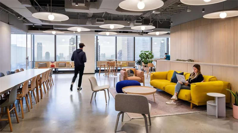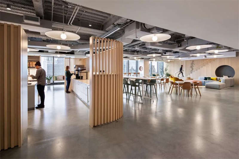 超大的開放式工作區(qū),其間穿插點(diǎn)綴著各式協(xié)作空間——從會議室到電話亭應(yīng)有盡有。兩個(gè)樓層都在建筑西側(cè)規(guī)劃了大而開敞的公共區(qū)域,這里享有廣闊的城市景觀視野和充足的日光,并通過一座木制樓梯上下緊密連接。