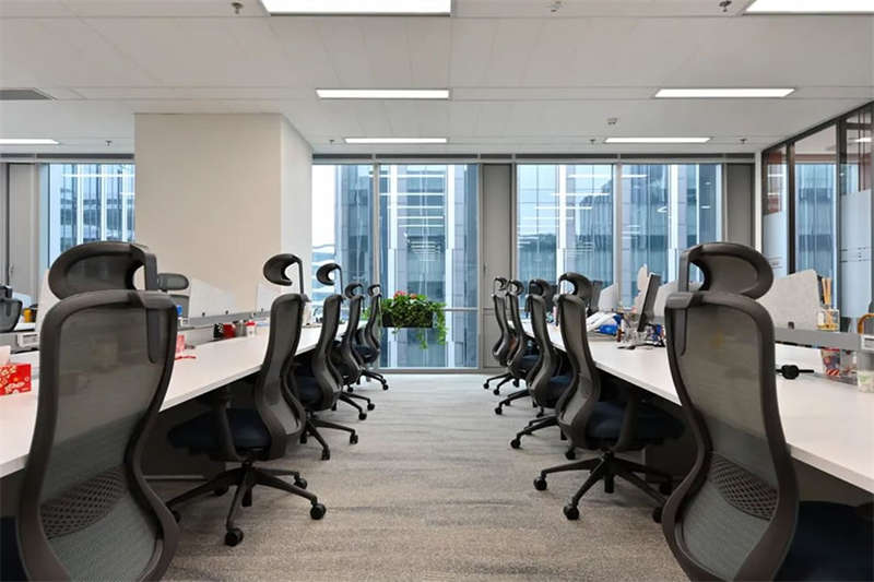 員工區(qū)部份選用了電動可調(diào)的升降辦公桌,以滿足員工個性化的需求,白灰色的家具搭配,混搭淺木色的休閑洽談區(qū)域,地面選用流線款長版的無膠水鋪裝的地毯相呼應(yīng)。提升了空間品質(zhì)和美感。