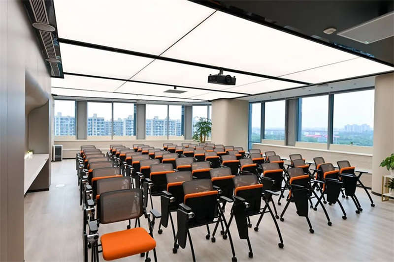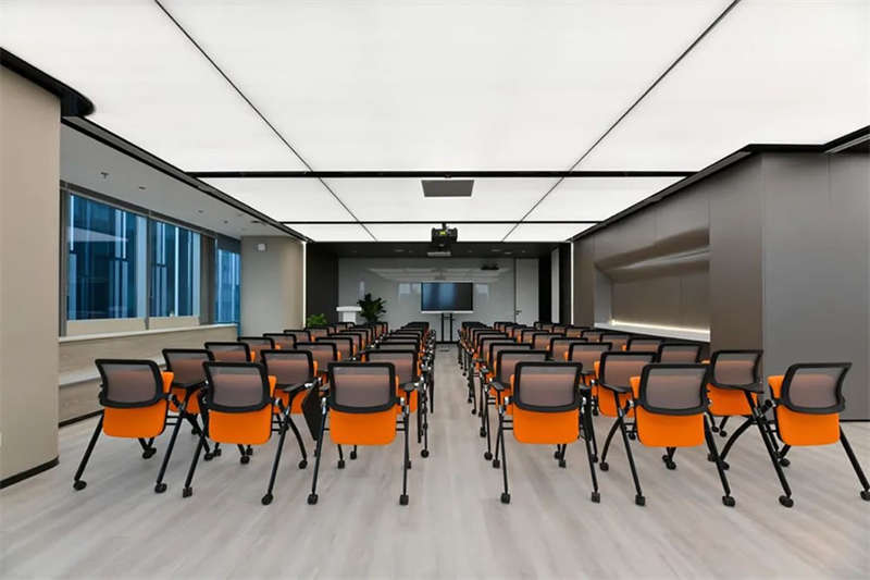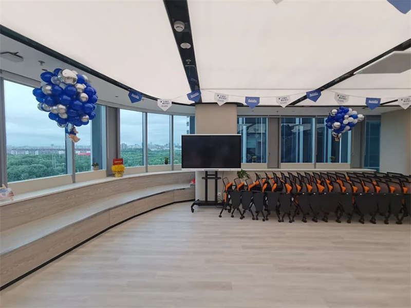 設(shè)計(jì)團(tuán)隊(duì)特意選擇了一處大型開敞的臨窗場地,在酷炫的3D裸眼展示室旁邊打造出了一個4S店風(fēng)格的培訓(xùn)和茶水的二合一空間,以滿足客戶快速發(fā)展的團(tuán)隊(duì)培訓(xùn)和新品發(fā)布的需求。在臨幕墻的位置,設(shè)計(jì)師原來就設(shè)計(jì)了一排沿窗的休閑階梯造型臺階,后來因?yàn)橐咔榉揽氐男枨?,把臺階內(nèi)的空間利用好,平時(shí)內(nèi)部可以儲藏睡袋,防疫物資,帳篷等物品。