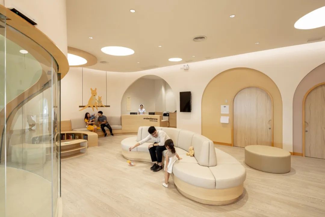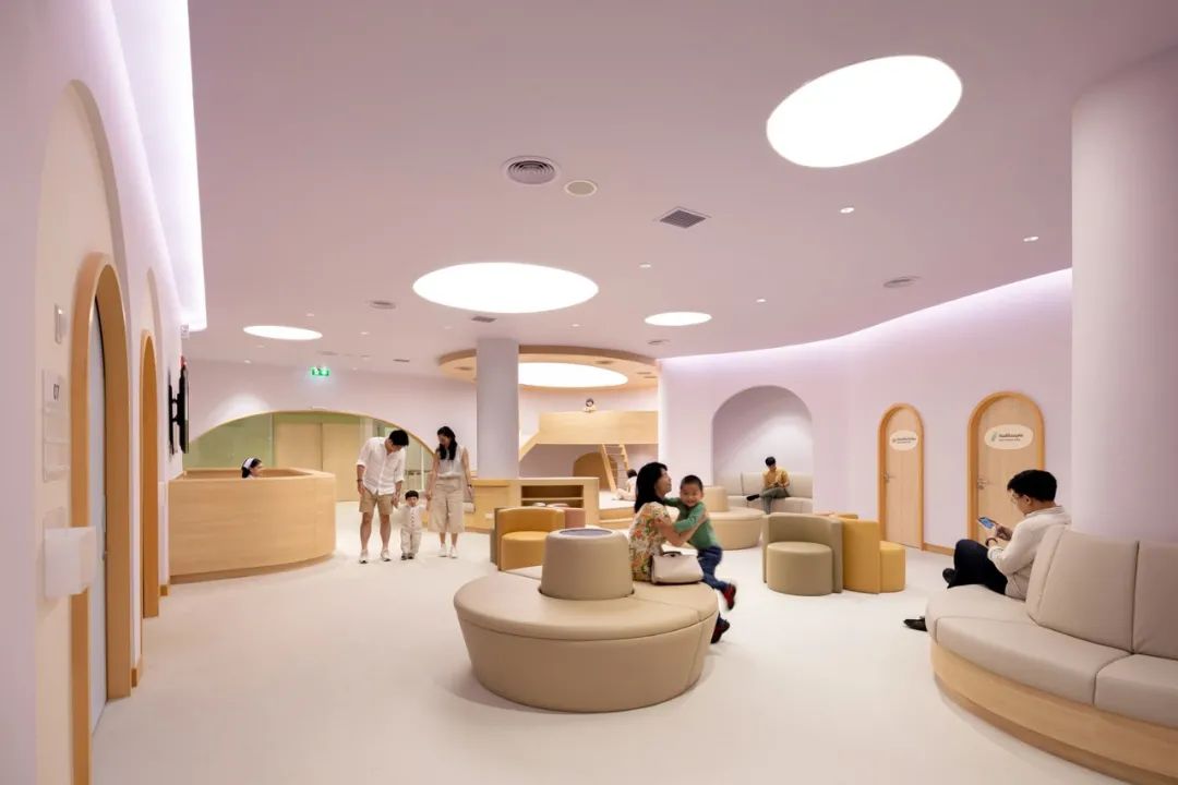 對(duì)于生病的孩子來說,富有趣味的內(nèi)飾才是關(guān)鍵,拱形門框讓看病成為一場趣味探險(xiǎn),消除了孩子與醫(yī)生間的隔閡。醫(yī)院的一樓和二樓都有兒童游戲區(qū)域,原本對(duì)于家長和孩子來說十分難熬的候診時(shí)間,便可以在這里悠閑的度過。當(dāng)然醫(yī)院內(nèi)也有專門的等候空間,不同于以往醫(yī)院中冷冰冰的不銹鋼座椅,柔軟的觸感、彎曲的造型都十分人性化。