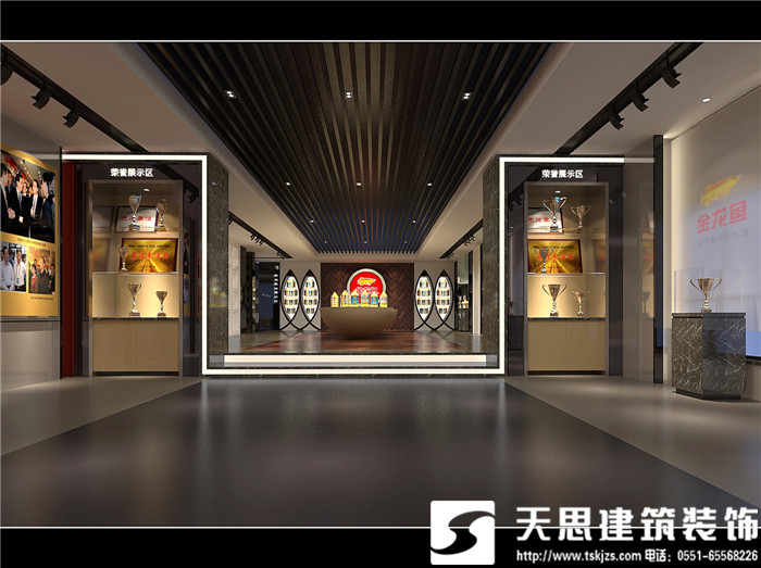 展廳是提高產(chǎn)品和企業(yè)品牌形象的場(chǎng)所,表達(dá)個(gè)性風(fēng)格是這個(gè)空間的關(guān)鍵。金龍魚通過(guò)利用地面折線分割跑道的表現(xiàn)與背景形象的鮮明顏色相互配合產(chǎn)生強(qiáng)烈視覺沖擊效果,令人耳目一新,印象深刻。在其中部設(shè)計(jì)中,運(yùn)用厚重的體量感,如半圓形及魚形,將所有的空間有機(jī)地聯(lián)系起來(lái),長(zhǎng)久、富貴、不可侵犯。