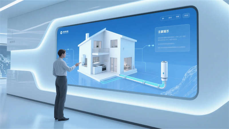 展廳以環(huán)形動(dòng)線串聯(lián)六大核心模塊:入口10米寬LED水幕墻動(dòng)態(tài)演繹凈水原理;中央懸浮式產(chǎn)品矩陣展臺(tái),通過(guò)全息投影拆解RO膜過(guò)濾技術(shù);實(shí)景化場(chǎng)景區(qū)1:1復(fù)刻家庭廚房、商務(wù)辦公樓及工業(yè)廠房,搭配交互式水質(zhì)監(jiān)測(cè)實(shí)驗(yàn)臺(tái);獨(dú)創(chuàng)的“虛擬管家”AR系統(tǒng),可生成個(gè)性化凈水方案并投射至合肥典型戶型模型。空間頂部采用參數(shù)化設(shè)計(jì)的波浪形燈網(wǎng),象征長(zhǎng)江與淮河水系交匯,地面嵌入城市節(jié)水?dāng)?shù)據(jù)可視化地磚,凸顯本土環(huán)保責(zé)任感。