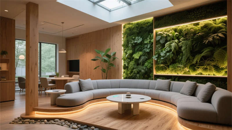 該展廳以“科技與自然共生”為理念,打造具有呼吸感的未來(lái)辦公展示空間。暖灰木紋肌理與流動(dòng)曲線構(gòu)筑空間骨架,智能光帶如脈絡(luò)貫穿始終,在冷調(diào)科技感中融入垂直綠植與天然材質(zhì),平衡數(shù)字時(shí)代的溫度需求。