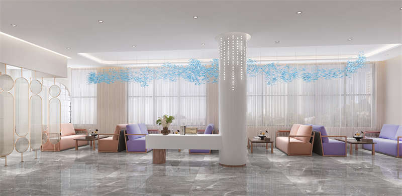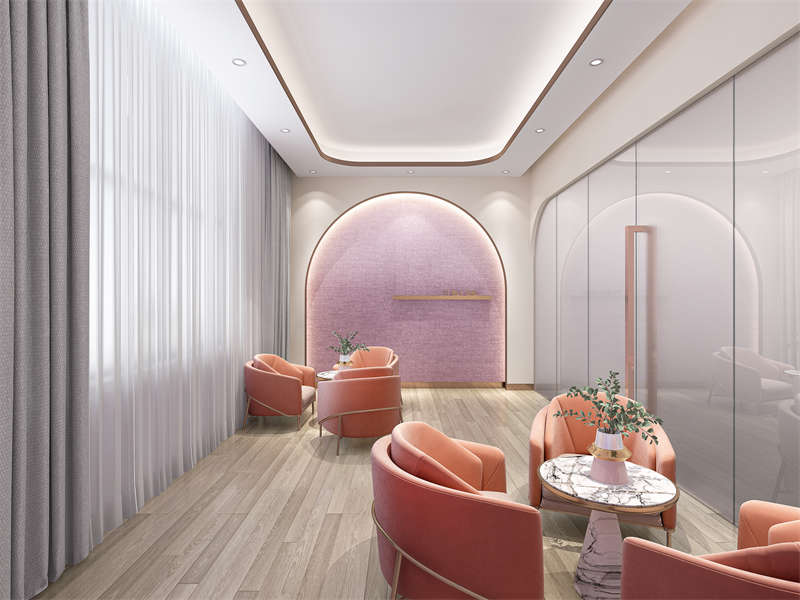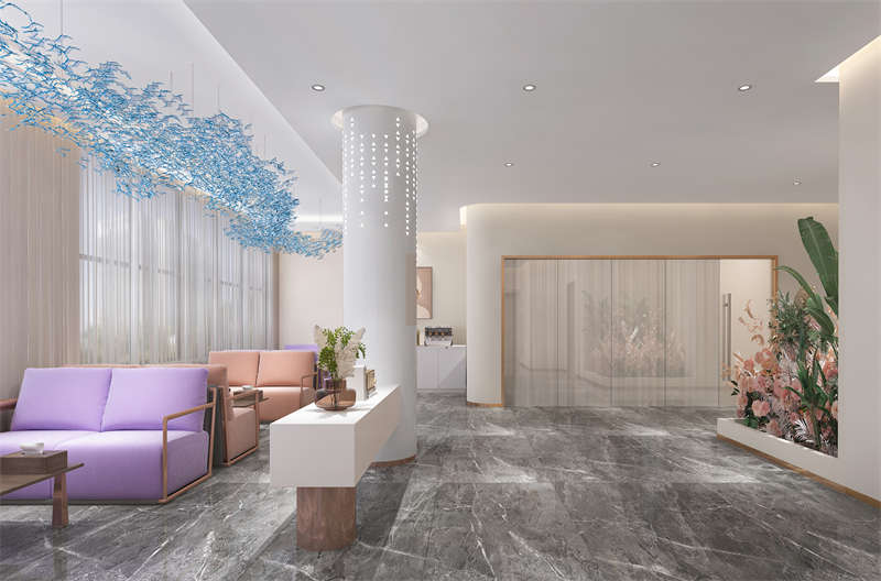 大廳,極致簡單的配色,與富有質(zhì)感的材質(zhì)碰撞,頂?shù)鯚纛佒蹈?、光線柔,烘托出醫(yī)美大廳的柔和氛圍。